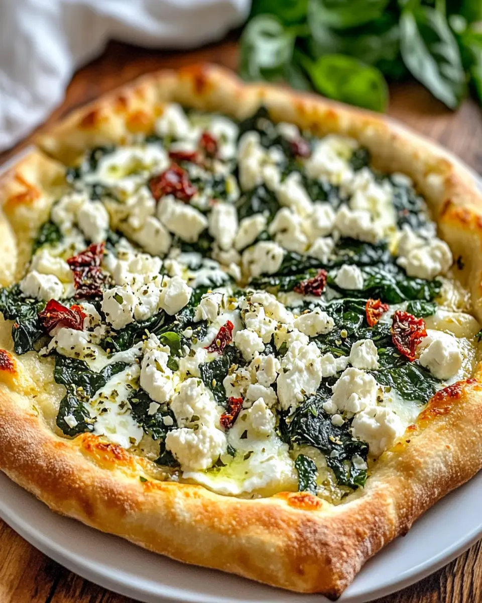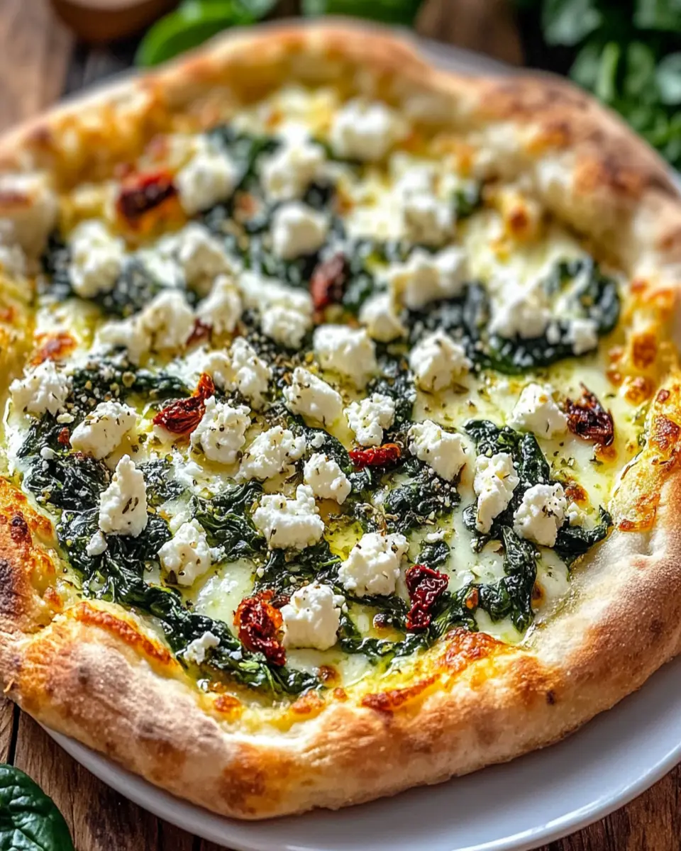 A delicious white pizza topped with roasted garlic, fresh spinach, and feta cheese, inspired by Greek flavors.